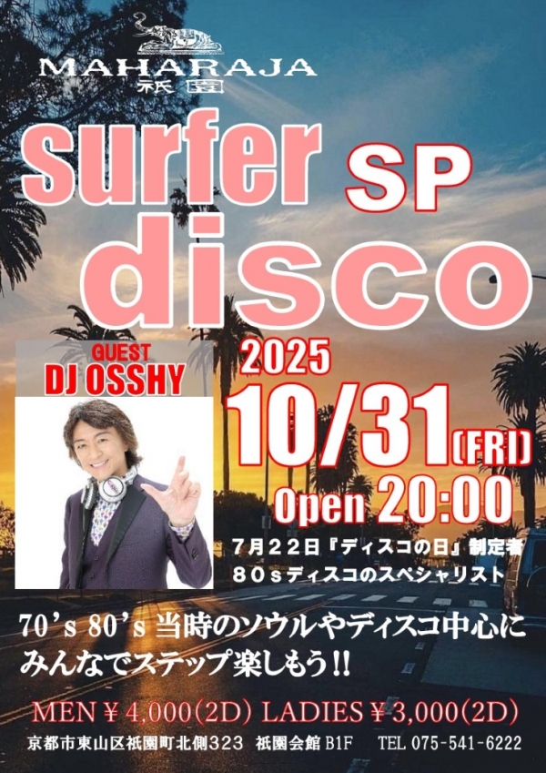マハラジャ祇園でDJ OSSHYがプレイ!surfer discoを一緒に楽しみましょう。