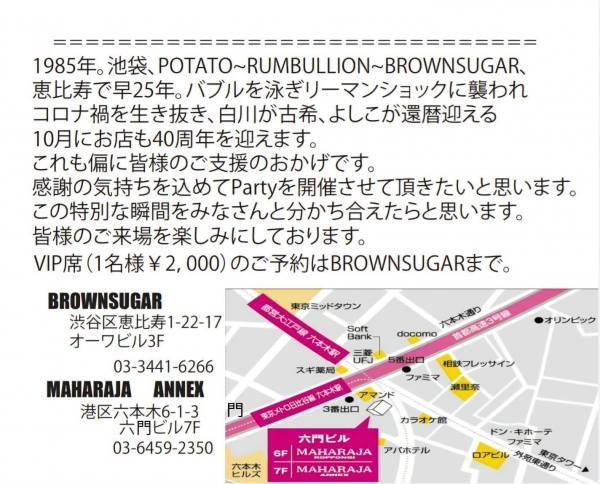 恵比寿の老舗ソウルバー、ブラウンシュガーの40周年パーティに出演!