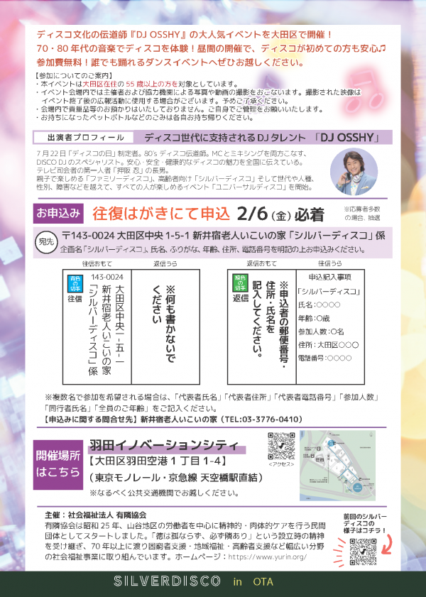企画名「シルバーディスコ」、氏名、ふりがな、年齢、住所、電話番号を明記の上お申込みください。